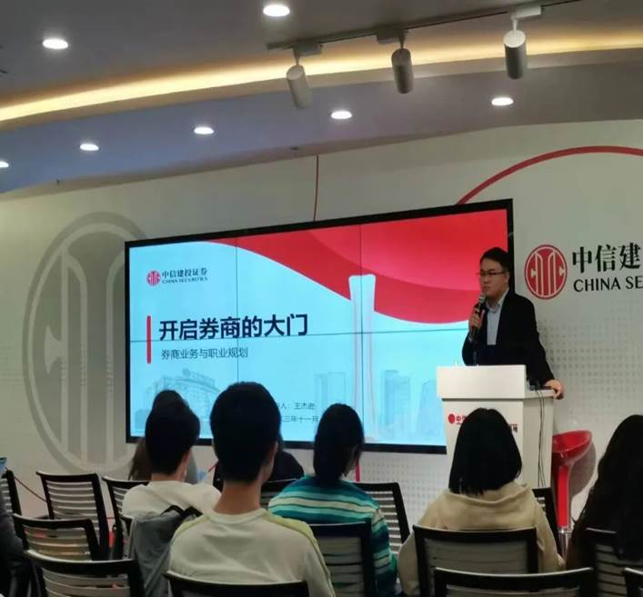 参观过各个展览区后,同学们来到专家讲堂区就座。本次讲堂以一部精彩的宣传片为开端,介绍了中信建投发展历程及其重大成就等。